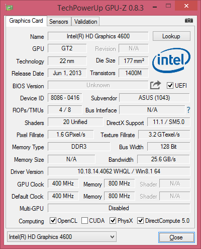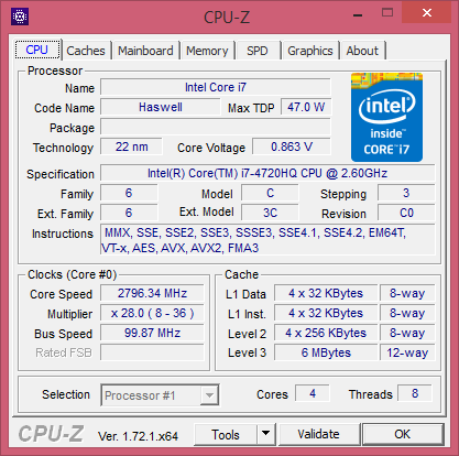 Итак, основой ноутбука Asus ZenBook Pro UX501JW является 22-нанометровый четырехъядерный процессор Intel Core i7-4720HQ. Он имеет номинальную тактовую частоту 2,6 ГГц, которая в режиме Turbo Boost может повышаться до 3,6 ГГц. Размер его кэша L3 составляет 6 МБ, а расчетная мощность — 47 Вт.