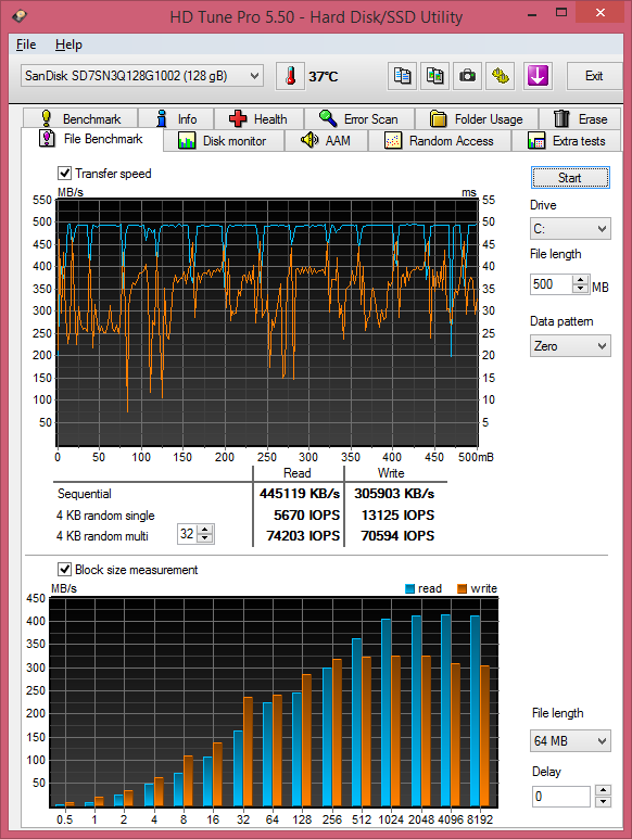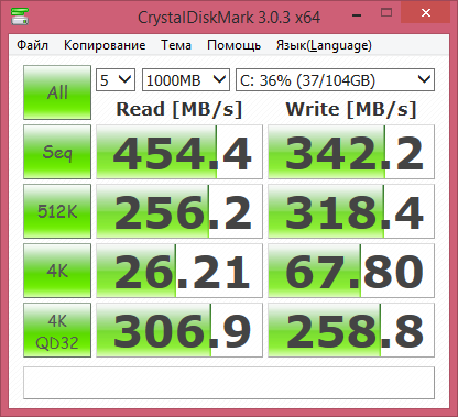 Напомним, что в ноутбуке Asus ZenBook Pro UX501JW установлен SSD-накопитель SanDisk SD7SN3Q-128G-1002 с разъемом M.2 и HDD накопитель HGST Travelstar Z5K100. Поскольку операционная система и приложения устанавливаются на SSD-накопитель, интересна именно его производительность.