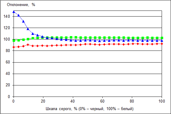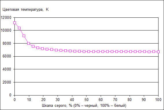 Цветовая температура ЖК-экрана стабильна по всей шкале серого (темные области можно не учитывать) и составляет примерно 6500 K.
