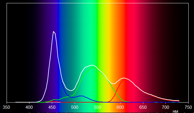 Светофильтры ЖК-матрицы немного подмешивают компоненты друг к другу. Так, в спектр красного цвета подмешивается зеленый цвет, а вот спектр синего цвета хорошо изолирован. Такая ситуация вполне типична для ЖК-матриц, используемых в ноутбуках.