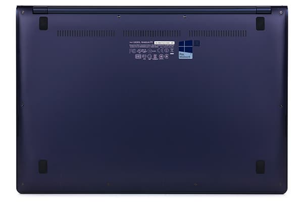 Нижняя панель корпуса ноутбука также выполнена из металла темно-синего цвета. Причем в данном случае поверхность матовая и на ощупь немного бархатистая.
