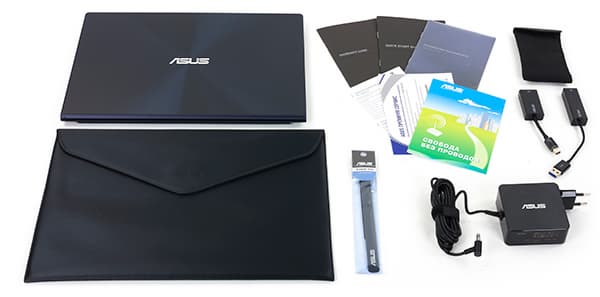 Ультрабук Asus Zenbook UX301LA поставляется во внешне непритязательной картонной коробке. Однако в ней находится еще одна, которая уже в полной мере соответствует элитному продукту. В этой красивой черной картонной коробке, кроме самого ультрабука, имеется чехол из материала, напоминающего кожу, адаптер питания 65 Вт (19 В; 3,42 А), инструкция пользователя и стандартный гарантийный талон, а также два переходника: с USB 3.0 на RJ-45 и с Mini-DisplayPort на VGA (d-Sub).