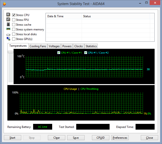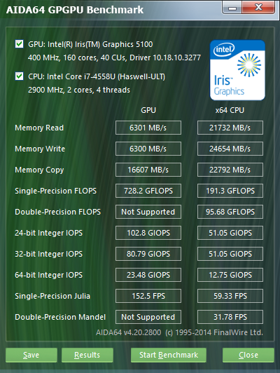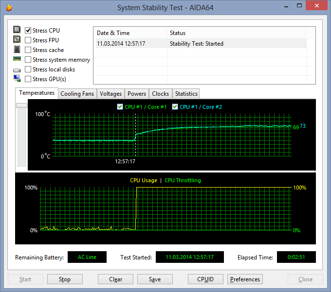При загрузке процессора тестом Stress CPU (утилитой AIDA64 Extreme Edition — тест на стабильность системы), который использует целочисленные вычисления, частота процессор составляет 3,2 ГГц (напомним, что для процессора Intel Core i7-4558U максимальная частота в режиме Intel Turbo Boost составляет 3,3 ГГц). Температура процессора в этом режиме загрузки увеличивается до 70-73 °С.