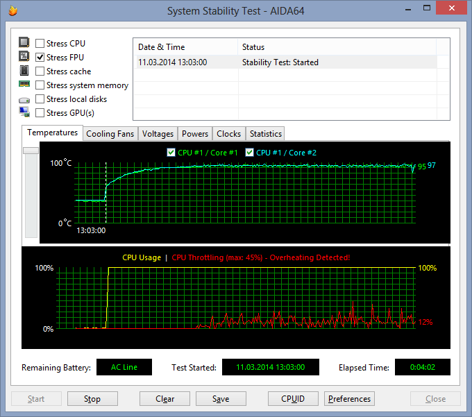 В режиме одновременной загрузки и ядер процессора (Stress FPU), и графического ядра (Stress GPU) картина не меняется. Ядра процессора работают на частоте 2,2-2,8 ГГц, а их температура составляет примерно 95-97 °С. В этом режиме также наблюдается троттлинг.