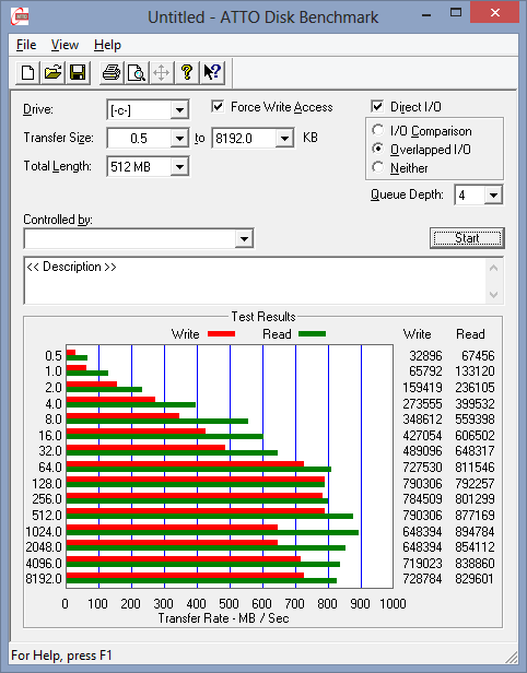 Утилита ATTO Disk Benchmark определяет максимальную скорость последовательного чтения на уровне почти 900 МБ/с, а скорость последовательной записи — на уровне почти 800 МБ/с. Это, безусловно, очень высокие скоростные показатели, и ни один современный одиночный SSD-накопитель (за исключением экзотики с интерфейсом PCI Express) не способен читать и писать на таких скоростях.