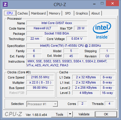 Итак, основой нашего ультрабука Asus Zenbook UX301LA является двухъядерный процессор Intel Core i7-4558U. Он имеет номинальную тактовую частоту 2,8 ГГц, которая в режиме Turbo Boost может повышаться до 3,3 ГГц. Размер его кэша L3 составляет 4 МБ, а расчетная максимальная мощность — 28 Вт. В этот процессор интегрировано графическое ядро Intel Iris Graphics 5100, базовая частота которого составляет 200 МГц, а частота в режиме Turbo Boost — 1,2 ГГц. Кроме того, ультрабуки Asus Zenbook UX301LA могут комплектоваться процессорами Intel Core i7-4500U и Core i5-4200U. Отметим, что все указанные процессоры производятся в SiP-упаковке, то есть чипсет интегрирован в процессор, а потому отдельного кристалла чипсета на материнской плате нет.