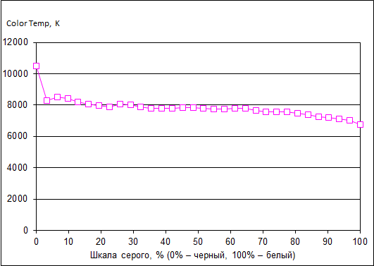 Завышенная цветовая температура объясняется тем, что доля красного цвета немного занижена по всей шкале серого.