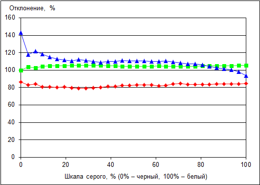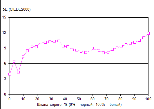 Что касается точности цветопередачи (дельта Е), то ее значение не превосходит 12, что является допустимым результатом для данного класса экранов.