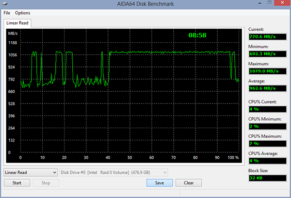 Тест AIDA64 Disk Benchmark определяет среднюю скорость последовательного чтения на уровне 960 МБ/с.