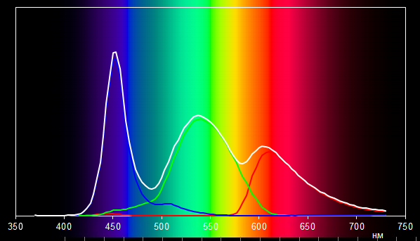 Светофильтры ЖК-матрицы немного подмешивают компоненты друг к другу. Так, в спектр красного цвета подмешивается зеленый цвет, а вот спектр синего цвета хорошо изолирован. Такая ситуация вполне типична для ЖК-матриц, используемых в ноутбуках.