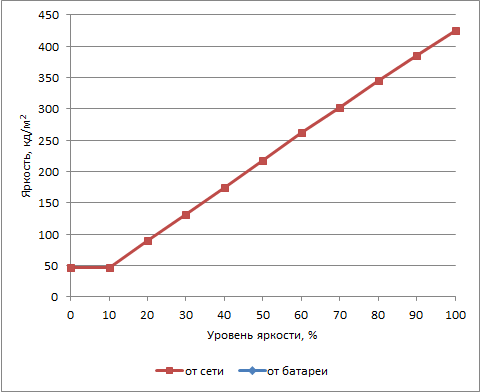 Зависимость яркости экрана от выставленного уровня яркости показана на графике. Как видим, в случае ультрабука Asus Zenbook UX301LA уровень яркости меняется линейно.