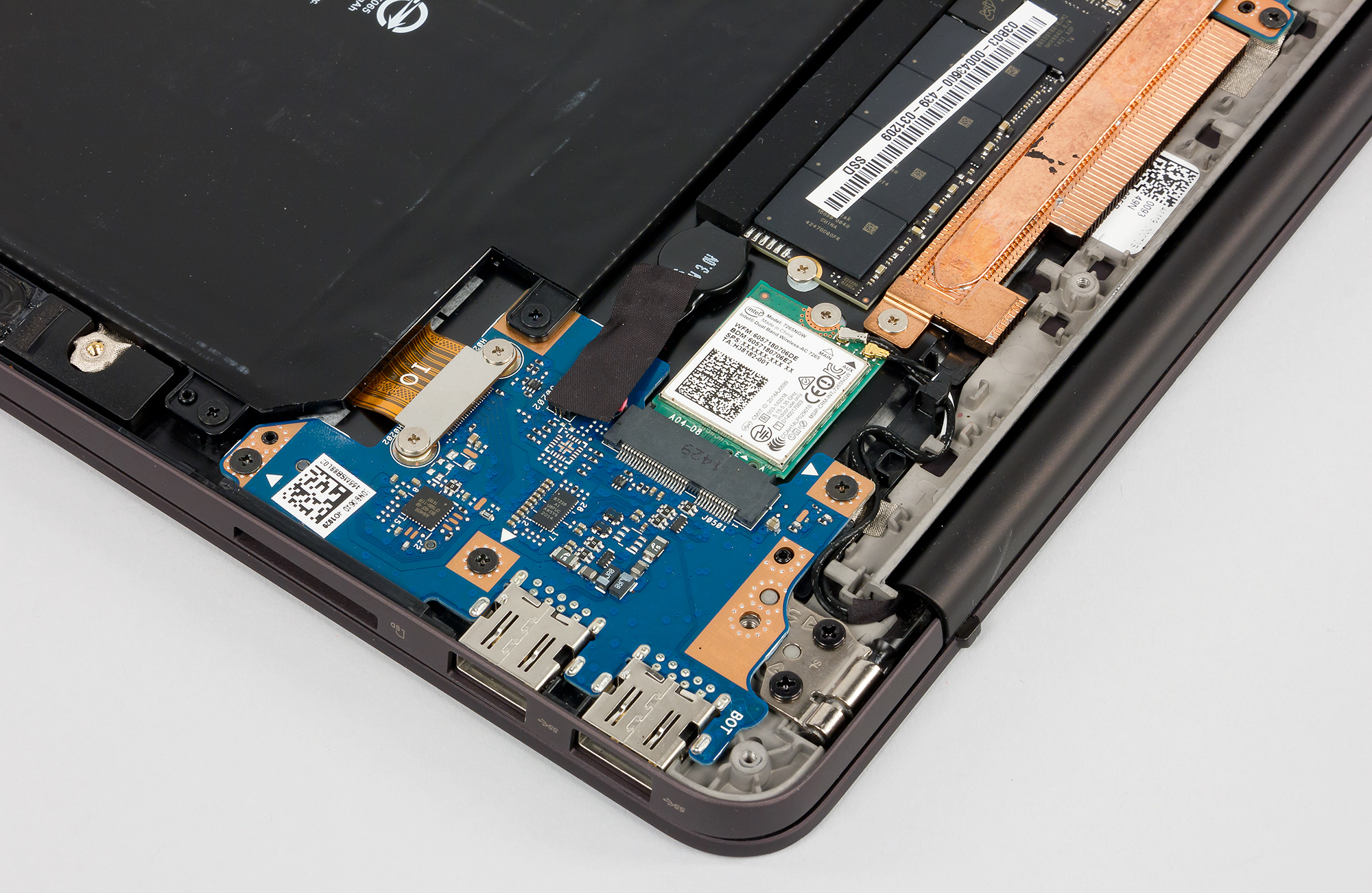 После этого можно получить доступ к аккумуляторной батарее, SSD-накопителю и модулю беспроводной связи.