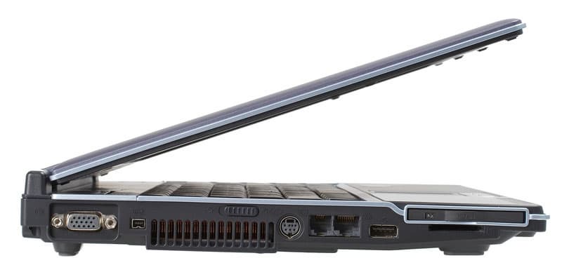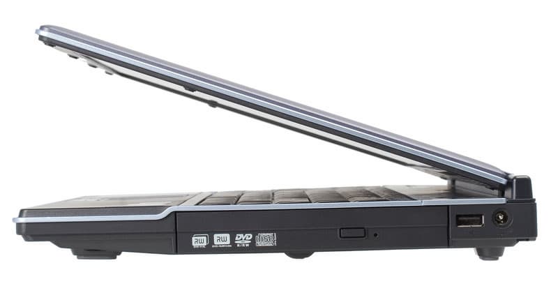 Внешне ноутбук действительно выглядит очень симпатисно из-за оригинальной ступенчатой серебристой окантовки, правда, наиболее выигрышно ноутбук смотрится в открытом виде. К сожалению, наши фотогафы выбрали ракурсы, по которым сложно оценить всю прелесть дизайнерских решений, остается отослать вас к фотографии в начале обзора. Справа — устройство для работы с оптическими дисками, порт USB и разъем для подключения источника питания.