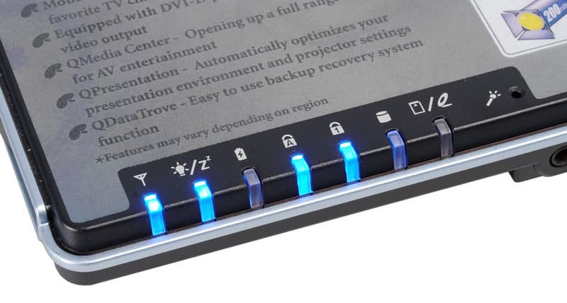 Все индикаторы собраны в один большой блок в левой части переднего торца. Не уверен, что это лучшее решение, по крайней мере смотреть на состояние Lock`ов крайне неудобно. К счастью, в большинстве офисных приложений эти данные отображаются на экране. Индикатор беспроводной сети по традиции BenQ трехцветный. Синий — Wi-Fi, янтарный — Bluetooth, оба вместе (в руководстве этот цвет назван пурпурным) — включены оба интерфейса.