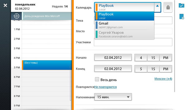 В принципе, Календарь предоставляет все необходимые возможности. В том числе, здесь есть возможность использовать аккаунт Gmail или Facebook. Таким образом, в Календаре будут появляться события из календарей Gmail и из Facebook (а добавленные на PlayBook — наоборот, опубликуются в этих онлайн-сервисах).