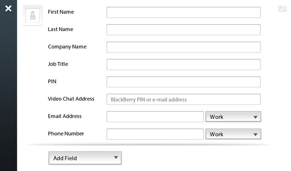 При создании нового контакта доступны все стандартные поля, в том числе можно ввести BlackBerry PIN для видеочата.