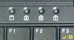 Еще одна линейка индикаторов расположена над левым верхним углом клавиатуры. Здесь все гораздо проще и привычнее для пользователей настольных ПК: светодиоды являются аналогами соответственно, индикатора активности винчестера, Caps Lock, Scroll Lock, и Num Lock.