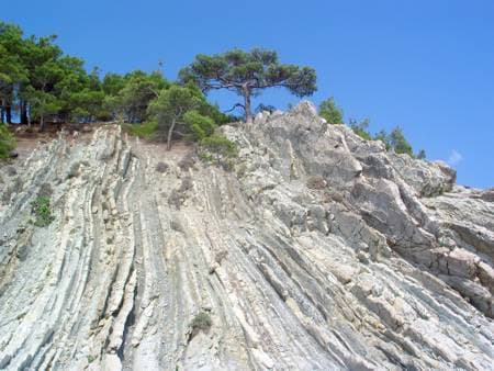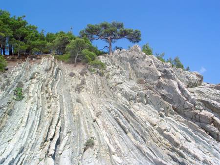 Ни ниже, ни выше ничего ровнее для парковки не было, поэтому машина «стала на якорь», уткнувшись в ствол сосны. Впрочем, парковка — это были еще цветочки, «пестня» была тогда, когда пришло время разворачиваться «карабкаться» вверх по склону. Добрая машина — это, конечно, хорошо, но без доброго водителя Morgue летели бы «клочки по закоулочкам». Кстати, вот так выглядел этот обрыв снизу — где то там, выше за деревцами припаркована машина (Дооб, окрестности Новороссийска, август 2003).