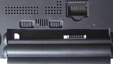На фото ниже без подробных разъяснений можно сразу определить расположение встроенных стерео динамиков. Ниже расположен слот для подключения дополнительной батареи питания, справа под ней — слот под дополнительную память, и еще ниже-правее — слот miniPCI. Слоты, разумеется, закрыты крышками, на фото лишь откинута крышка слота для подключения дополнительной батареи.
