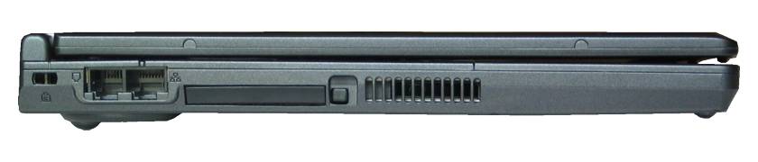С левой стороны корпуса расположены порт для замка Kensington Lock, порты сетевой карты и факс-модема, а также слот Compact Flash и вентиляционные отверстия.