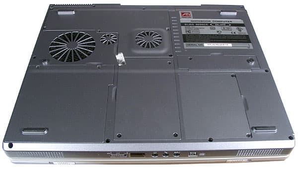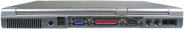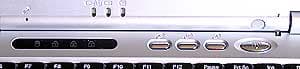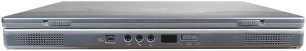 Спереди — две защелки крышки, порт IEEE1394, аудиоразъемы, окошко ИК-порта и выключатель беспроводной сети. По бокам есть динамики. Расположение ИК-порта на переднем торце при «настольном» положении ноутбука вполне оправдано, порт IEEE1394 тоже особых нареканий не вызывает, хотя лучше бы все-таки, на мой взгляд, поместить его сбоку — такие устройства, как внешние диски требуют еще и подключения питания, а это уже лишние провода спереди. С аудиоразъемами все не так хорошо. Если микрофонный вход и выход на наушники на переднем торце — это достаточно удобно, то линейный вход и тем более S/PDIF выход здесь явно ни к чему.