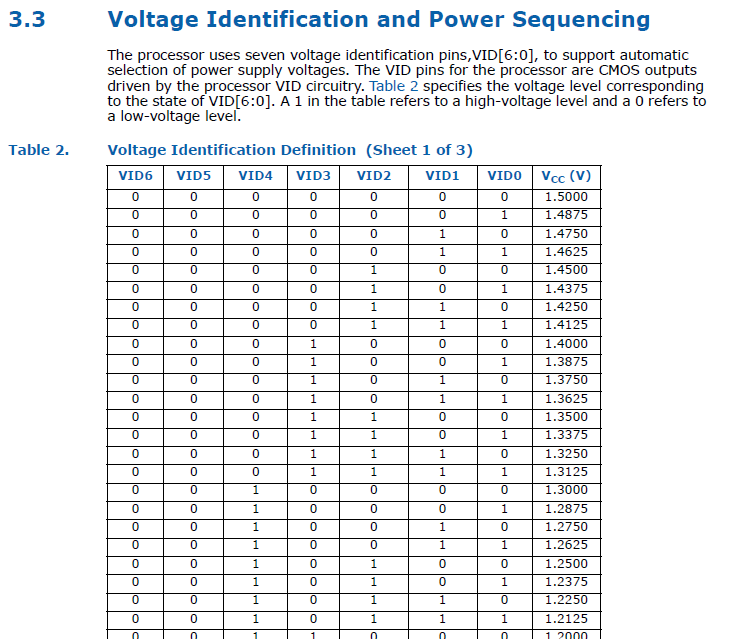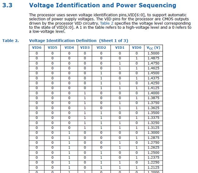 На современных процессорах Intel имеется несколько ножек (площадок, пинов), отвечающих за напряжение на ядре (далее VID-пины, VID=Voltage Identification). Напряжение на процессоре устанавливает импульсный стабилизатор питания с логическим управлением. При запросе напряжения, процессор подаёт низкий (логический ноль, обычно масса, VSS) и высокий (логическая единица, определенное напряжение, VCC) уровни на VID-пины. Комбинация таких 0 и 1 на этих пинах и определяет подаваемое на процессор напряжение. VID-пины процессора напрямую (обычно через резисторы) соединены с VID-пинами стабилизатора, и в зависимости от состояния VID-пинов процессора стабилизатор выставляет запрошенное процессором напряжение. Чтобы было понятней, приведу отрывок таблицы напряжений из даташита на мобильные Core 2 Duo: