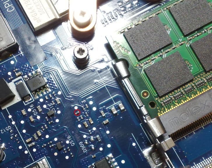 Красным кружочком обведен резистор. Прямо под ним находится резистор, номинал которого нужно увеличивать (впрочем, возможно это и не он, на момент написания статьи прошло уже почти полгода с того времени, когда вольтмодилась память в подопытном ноутбуке, поэтому если кому-нибудь после прочтения данного материала захочется броситься с разбегу вольтмодить Samsung R560, советую перепроверить).