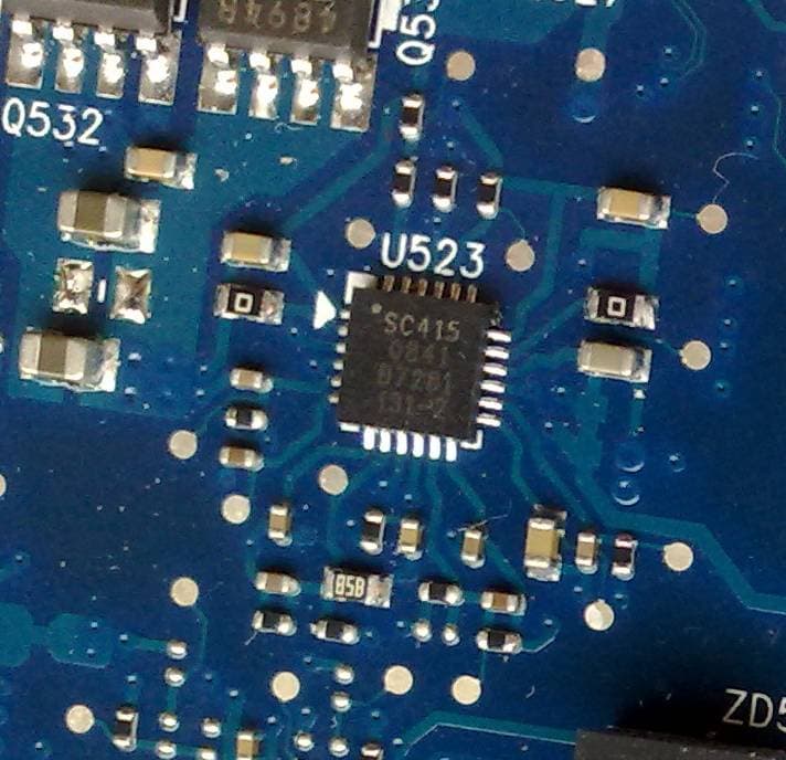 - Физический. Требует навыков обращения с паяльником, самого паяльника и отсутствие сожаления о потерянной гарантии. Нужные VID-пины в сокете прозваниваются тестером с ногами управляющей микросхемы. Когда пины на микросхеме найдены, то вольтметром на плате ищется напряжение, равное высокому уровню управляющей микросхемы, и подается на пин микросхемы (через сопротивление, если оно там установлено), который надо обратить в «1». При этом пин микросхемы желательно отключать от процессора, во избежание его выхода из строя. Чему равен высокий уровень можно либо посмотреть в даташите на микросхему, либо замерить напряжение на одном из VID-пинов этой самой микросхемы, перебирая их все по очереди, до обнаружения единицы. Напряжение высокого уровня можно найти на плате тестером, подойдет любой источник, кроме напряжения самого процессора. Найти микросхему просто, она находится рядом с сокетом, либо со стороны процессора, либо с другой стороны, и выглядит примерно так:
