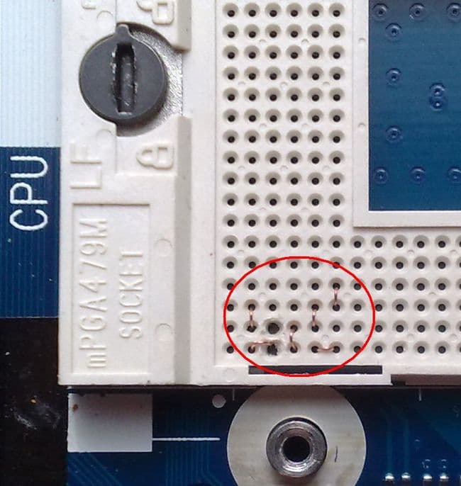 Теперь подробней о том, как сделать перемычки в сокете. Количество способов, как замкнуть между собой пины процессора, ограничивается лишь Вашей фантазией. Я предлагаю самый простой и, на мой взгляд, самый доступный, хоть и в какой-то мере деструктивный способ. Из инструментов понадобится только канцелярский нож и пинцет (необязательно). Из подручных материалов — 80-жильный шлейф IDE. Перемычки изготавливаются из зачищенной жилы шлейфа и имеют форму буквы «П». Когда перемычки установлены в сокет, выглядит это примерно так (на развальцованные отверстия внимания не обращаем):