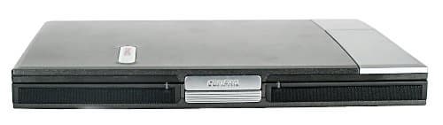 Передняя часть смотрится суперстильно. Огромная серебристая застежка (опять же, естественным образом намекающая на папку для бумаг), черные динамики... Не знаю, как вам, а мне рубленые грани корпуса именно здесь очень нравятся. Из функционала следует отметить великолепные колонки JBL, выведенные вперед (что дает нам первый намек на то, что и мультимедийное использование ноутбука также предполагается).