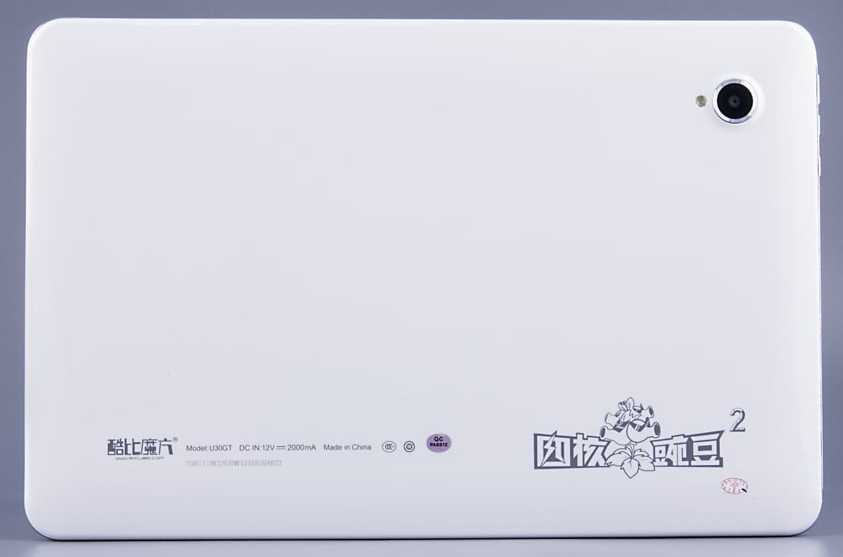 На задней панели планшета присутствует тыловая камера с подсветкой, а также большой аляповатый логотип производителя, созданный под влиянием игры Plants vs. Zombies. В строчке слева приведена некоторая информация об устройстве (номер модели, кстати, указан в ней некорректно).