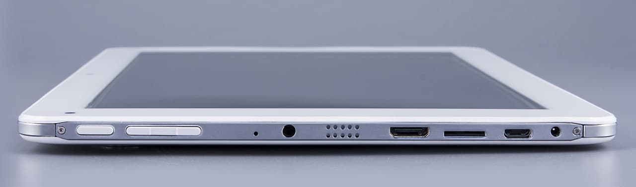 Набор разъемов включает гнездо сетевого адаптера, Micro-USB, слот карты памяти, Mini-HDMI и разъем наушников. С другой стороны находятся кнопки выключения и регулировки громкости. Предназначение маленьких отверстий посередине мы так и не смогли определить, лишь узнали, что они не скрывают ни микрофон, ни динамик, ни отверстия для принудительной перезагрузки.