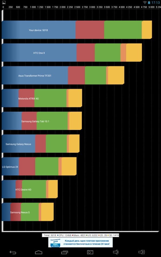 Quadrant Benchmark неожиданно присвоил нашему герою очень низкий показатель производительности в 2D (оранжевый цвет в результирующей колонке не виден вообще). Вообще, согласно спецификациям, у Rockchip RK3188 присутствует отдельный процессор для обработки двухмерной графики.