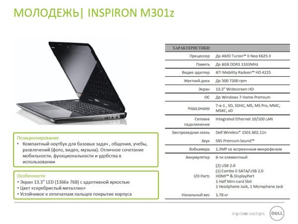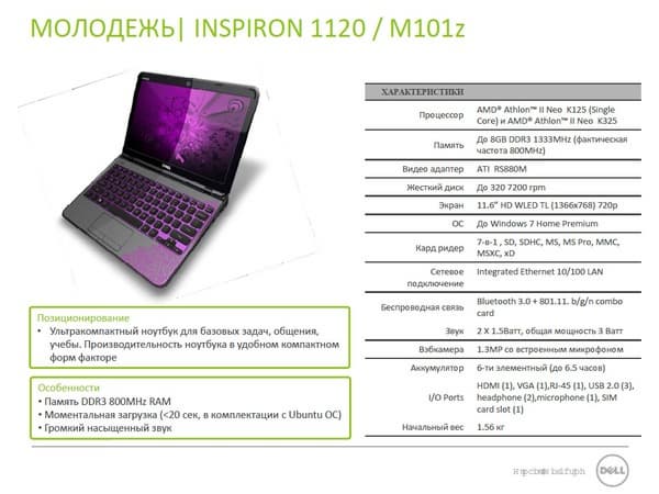 По позиционированию Inspiron 3120 должен быть стильным тонким ноутбуком, портативным, но при этом функциональным и удобным. В нем используется новый тип батареи, что позволяет получить более тонкий корпус.