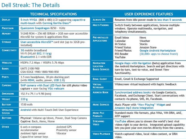 По словам представителей Dell, проект Streak очень важен для компании, его разработкой и выводом на рынок занимается отдельная большая команда разработчиков. Он позиционируется отнюдь не как коммуникатор или, упаси боже, телефон (с такими-то размерами), а как универсальное многофункциональное устройство: ридер, фоторамка, персональный планировщик, планшет (в т. ч. для работы с офисными документами и почтой в дороге), навигатор, развлекательное устройство, интернет-устройство и т. д. Для Streak в комплекте идет автомобильный держатель и настольная док-станция. То есть, придя домой, можно просто вставить планшет в док — и он подключится к компьютеру и начнет заряжаться.