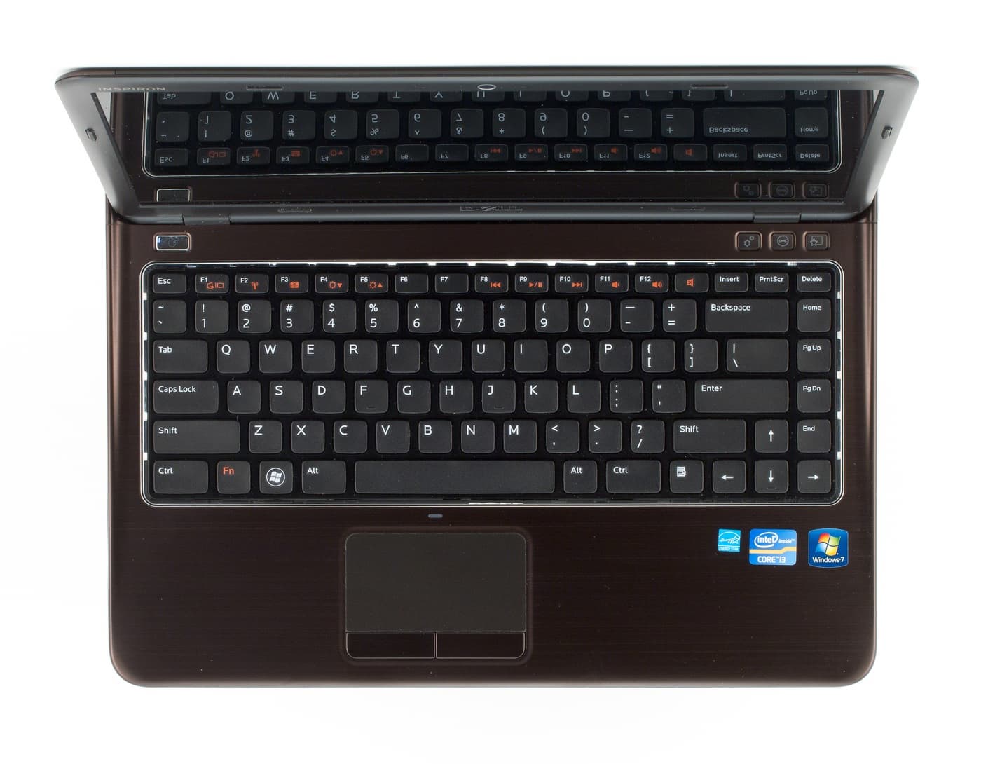 Открытый ноутбук в целом сохраняет тот же спокойный рабочий вид, что и закрытый. Клавиатурная панель тоже металлическая и коричневая, тачпад с ней одного цвета и лишь не много утоплен, так что на панели выделяется слабо. Клавиатура черная, причем клавиши из матового пластика, а подложка — из глянцевого. Вокруг клавиатуры идет хромовый молдинг, визуально оживляющий ноутбук. Плоская рамка экрана сделана из матового пластика и вообще никак не обращает на себя внимание. Эстетам могут не понравиться синие наклейки на коричневом фоне, уж больно неприятное сочетание цветов.