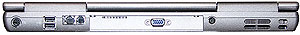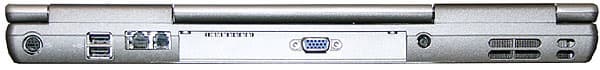 Все основные порты собрались тут: S-Video out, два порта USB 2.0, гнездо модема, разъем для подключения к локальной сети, VGA-выход и отверстие для шнура питания.