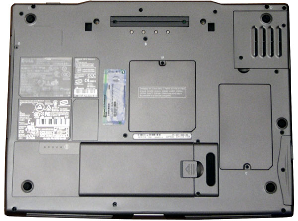 Перевернув ноутбук обнаруживаем внушительных размеров отсек для батареи, два отсека, ведущие к памяти и слоту mini-PCI, где обычно установлена Wi-Fi-карта.