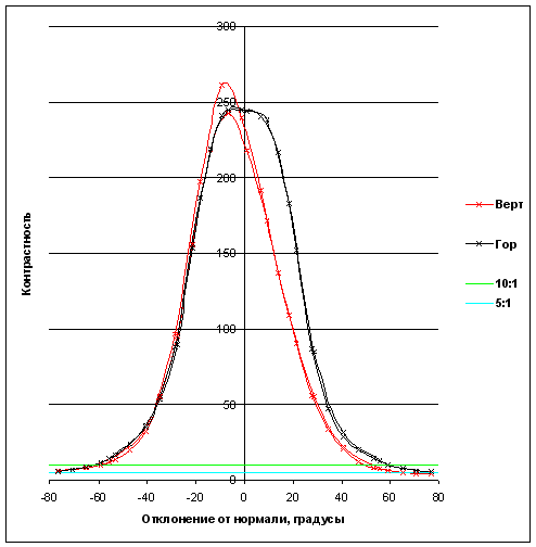 Зависимость контрастности (отношения яркости белого поля к яркости черного) в центре экрана от отклонения оси датчика (отрицательные значения — влево или вниз, положительные значения — вправо или вверх) от нормали к экрану в вертикальной и горизонтальной плоскостях. Зеленая линия — отношение 10:1, голубая — 5:1
