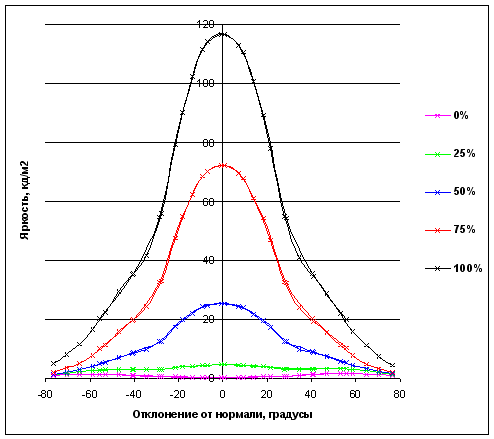 Зависимость яркости полутонов (0% — черный, 100% — белый) в центре экрана от отклонения оси датчика (отрицательные значения — вниз, положительные значения — вверх) от нормали к экрану в вертикальной плоскости