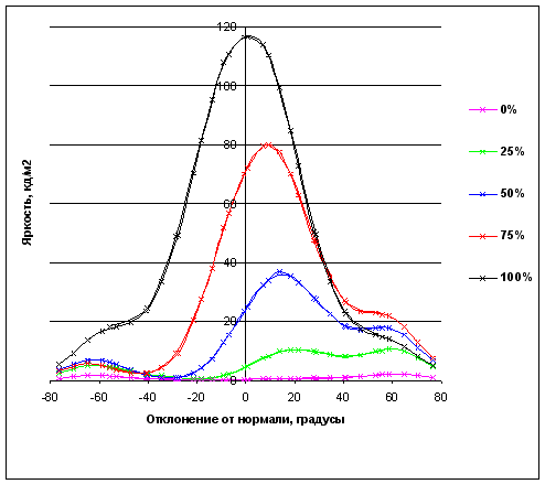 Зависимость яркости полутонов (0% — черный, 100% — белый) в центре экрана от отклонения оси датчика (отрицательные значения — влево, положительные значения — вправо) от нормали к экрану в горизонтальной плоскости