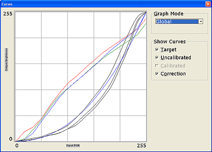 Приведены также графики гамма-кривых, где можно увидеть, насколько гамма-кривые индивидуальных цветов (черные линии) отклоняются от целевой гамма-кривой (синяя линия) и какая требуется коррекция для каждого цвета (соответственно красная, синяя и зеленая линии).