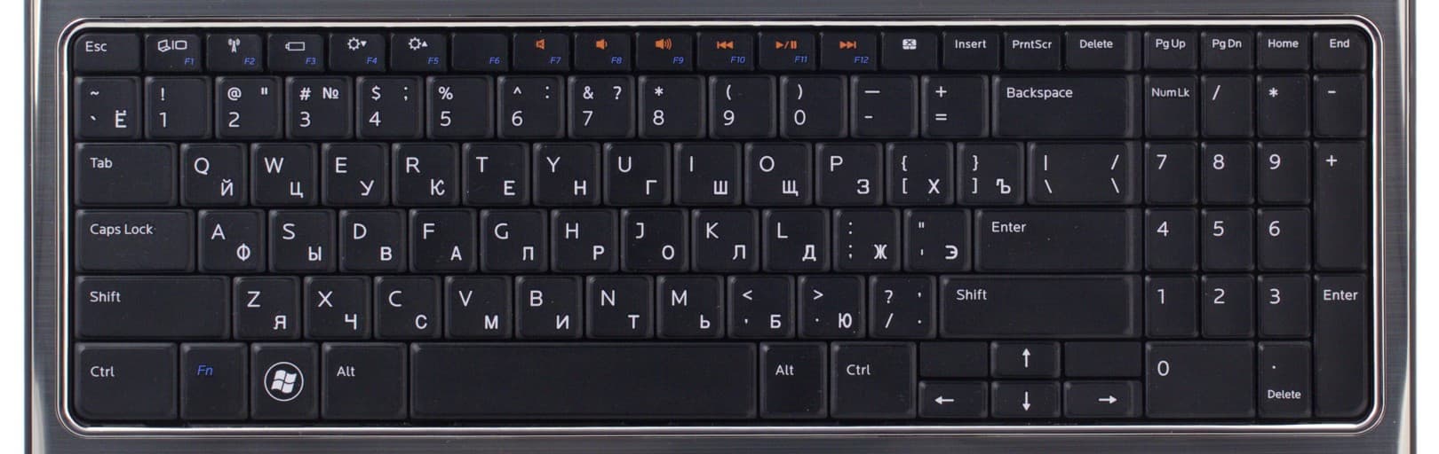 Клавиши обрамлены своеобразным пояском, так что промежутки между ними минимальны. Нажатие тактильно очень приятное: четкое, с минимальным люфтом, углублений под пальцы на алфавитных клавишах нет, но оно практически уже и не встречается на ноутбуках. С точки зрения длительной работы с текстами, неудобства могут возникнуть лишь по той причине, что алфавитное поле смещено относительно центра влево. Это позволило разместить цифровой блок (причем во всех отношениях полноценный, работать с ним очень удобно, для тех кто привык набирать таким образом цифры или управлять курсором на настольной клавиатуре). Однако при печати текста надо либо смещать клавиатуру вправо (а с ней, увы, и весь нотбук), либо принимать вынужденную позу и тянуться правой рукой влево, что явно не на пользу здоровью. Также обращает на себя внимание увеличенная высота нижнего ряда клавиш, зато верхние уменьшены до минимума, так что пользователи с толстыми пальцами вынуждены будут приноравливаться.