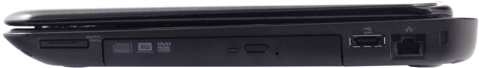 Несмотря на то, что крышка крепится к верхней панели, максимальный угол при открывании, как минимум, не меньше, чем у большинства современных ноутбуков с традиционным расположением петель (а возможно и чуть больше: около 145 градусов). Экран удается оптимально отрегулировать, даже если ноутбук лежит на коленях, хотя было бы, конечно, здорово предусмотреть возможность раскрыть его полностью. И, как видно на фотографии, еще одним следствием такого дизайна стала возможность перенести на заднюю панель часть периферийных разъемов, что теоретически должно способствовать более удобному их расположению. Посмотрим, так ли это в действительности.