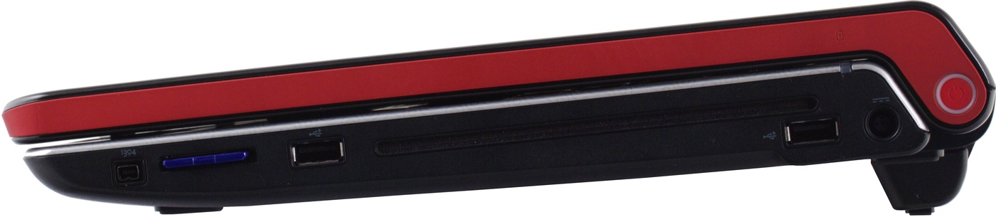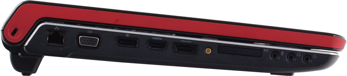 Левая грань очень плотно усеяна разнообразными разъемами. Порт замка Кенсингтона вынесен на место крепления крышки (и внутри, видимо, является частью одной из петель, крепящих экран). На корпусе расположены (слева направо): разъем проводной сети, VGA-выход, DisplayPort и HDMI, eSATA, комбинированный с USB, потом идет разъем антенны, далее — слот ExpressCard 34 мм. Ближе всего к передней грани расположены аудиоразъемы: микрофонный вход и целых два выхода на наушники. Оба выхода усиленные, т. е. могут работать на наушники, разницы между ними нет.