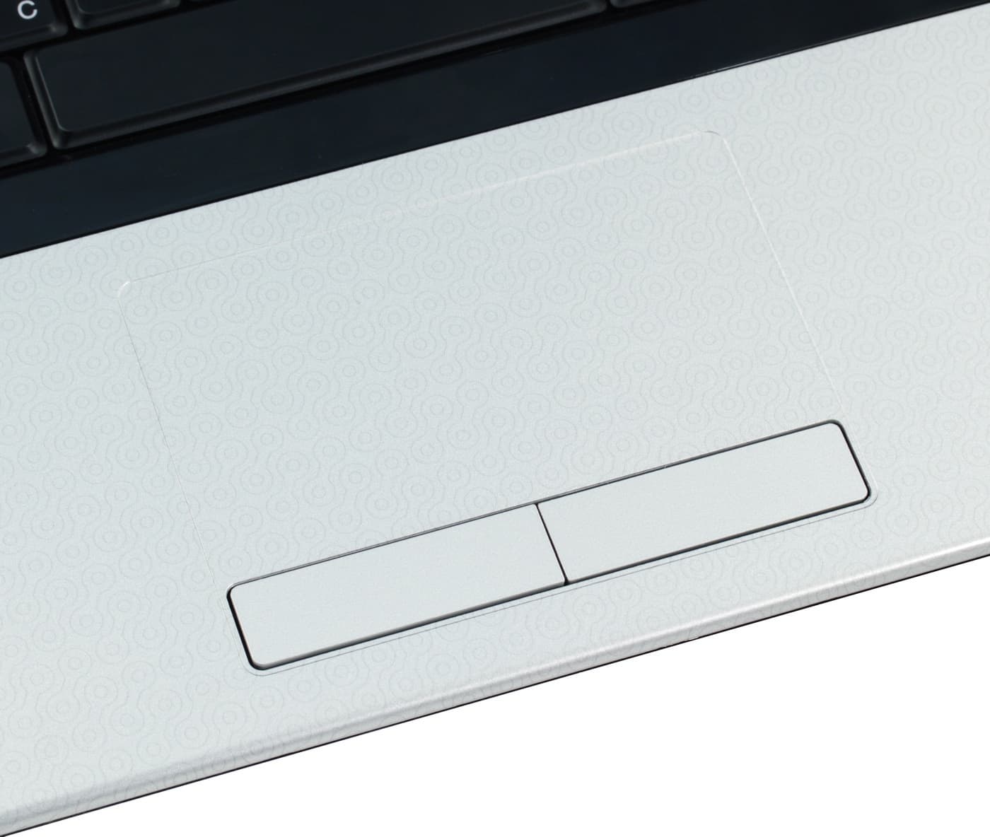 С открытой крышкой ноутбук тоже кажется простоватым. Передняя часть клавиатурной панели серая с текстурой в виде тонких контурных гантелей и совсем не цепляет взгляд. В панель врезаны серебристые крышечки динамиков JBL (выглядят, на мой взгляд, просто ужасно), между ними расположен тачпад (просто выделенная контуром зона на панели) с двумя простыми серо-серебристыми кнопками. Вокруг клавиатуры сделана вставка из глянцевой пластмассы, вот она смотрится привлекательно. Кстати, обратите внимание: там, где расположены сенсорные кнопки, есть матовая вставка, на которой не остаются отпечатки пальцев. Внутренняя крышка экрана черная и глянцевая. Отпечатки пальцев на глянцевых деталях сильно заметны, но эти детали расположены в таких местах, что пальцы туда редко попадают, поэтому у ноутбука есть шанс долгое время сохранять опрятный вид.