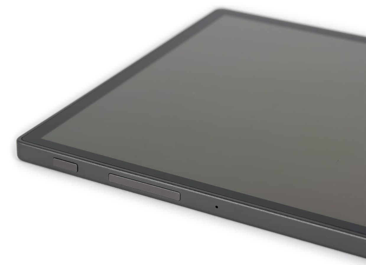 Большую часть тыльной и боковой панели обхватывает цельная металлическая пластина, придающая планшету солидности. Эта деталь устойчива к отпечаткам пальцев. Но при неосторожном обращении из-за нее планшет легко может выскользнуть из рук. И, учитывая компоновку деталей, без повреждений в этом случае вряд ли обойдется.