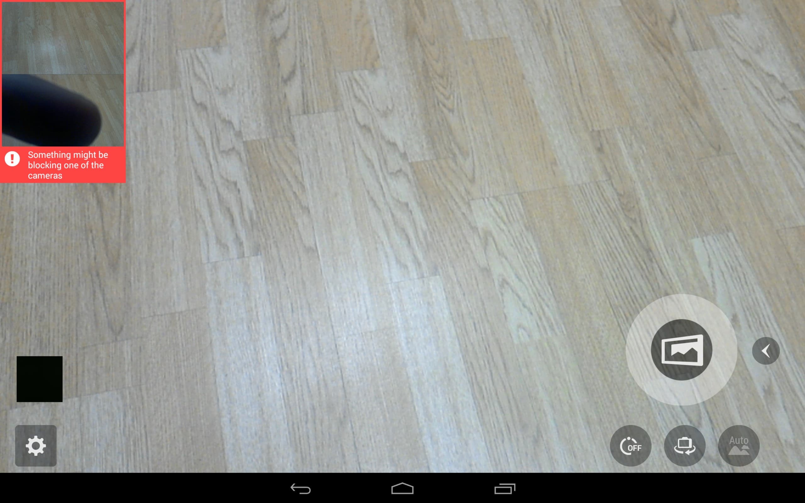 | Если закрыть пальцем одну из камер, что нередко случается из-за своеобразной компоновки планшета, камера сообщит об этом красной рамкой вокруг окна, отображающего сигнал со вспомогательных камер. |