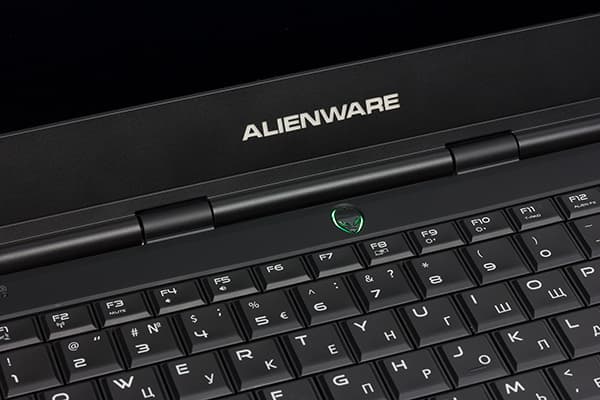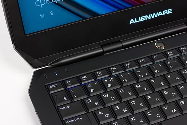 Над клавиатурой по центру расположена кнопка включения питания в форме головы пришельца (логотип Alienware). Более никаких кнопок в ноутбуке не предусмотрено. Кнопка питания подсвечивается, и цвет подсветки можно настраивать.