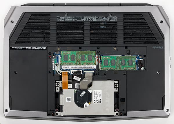 Одной из особенностей ноутбука Alienware 13 является возможность его разборки. Как уже отмечалось, на нижней панели корпуса расположен небольшой лючок, который можно легко снять, открутив всего два винтика. Это позволит получить доступ к модулям памяти и накопителю.